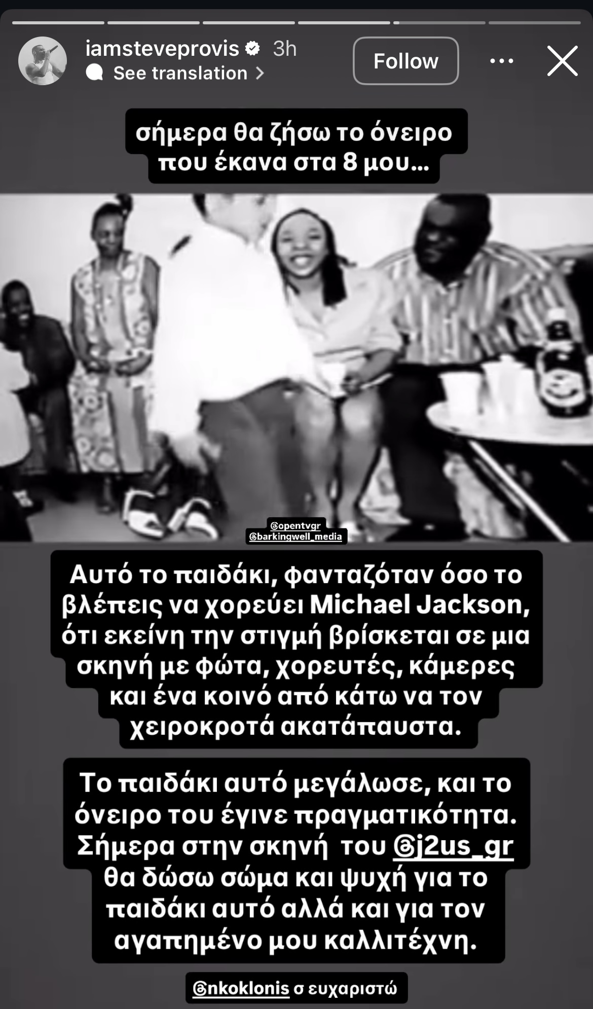 Στο προσωπικό του story, ο ίδιος περιέγραψε με συγκίνηση το πώς, από την ηλικία των 8 ετών, φανταζόταν τον εαυτό του να χορεύει σαν τον Michael Jackson πάνω σε μια μεγάλη σκηνή, με φώτα, χορευτές, κάμερες και ένα κοινό που τον χειροκροτεί ασταμάτητα. Όπως χαρακτηριστικά ανέφερε, το «παιδάκι» εκείνο μεγάλωσε, αλλά το όνειρο δεν έσβησε ποτέ — αντίθετα, σήμερα γίνεται πραγματικότητα.