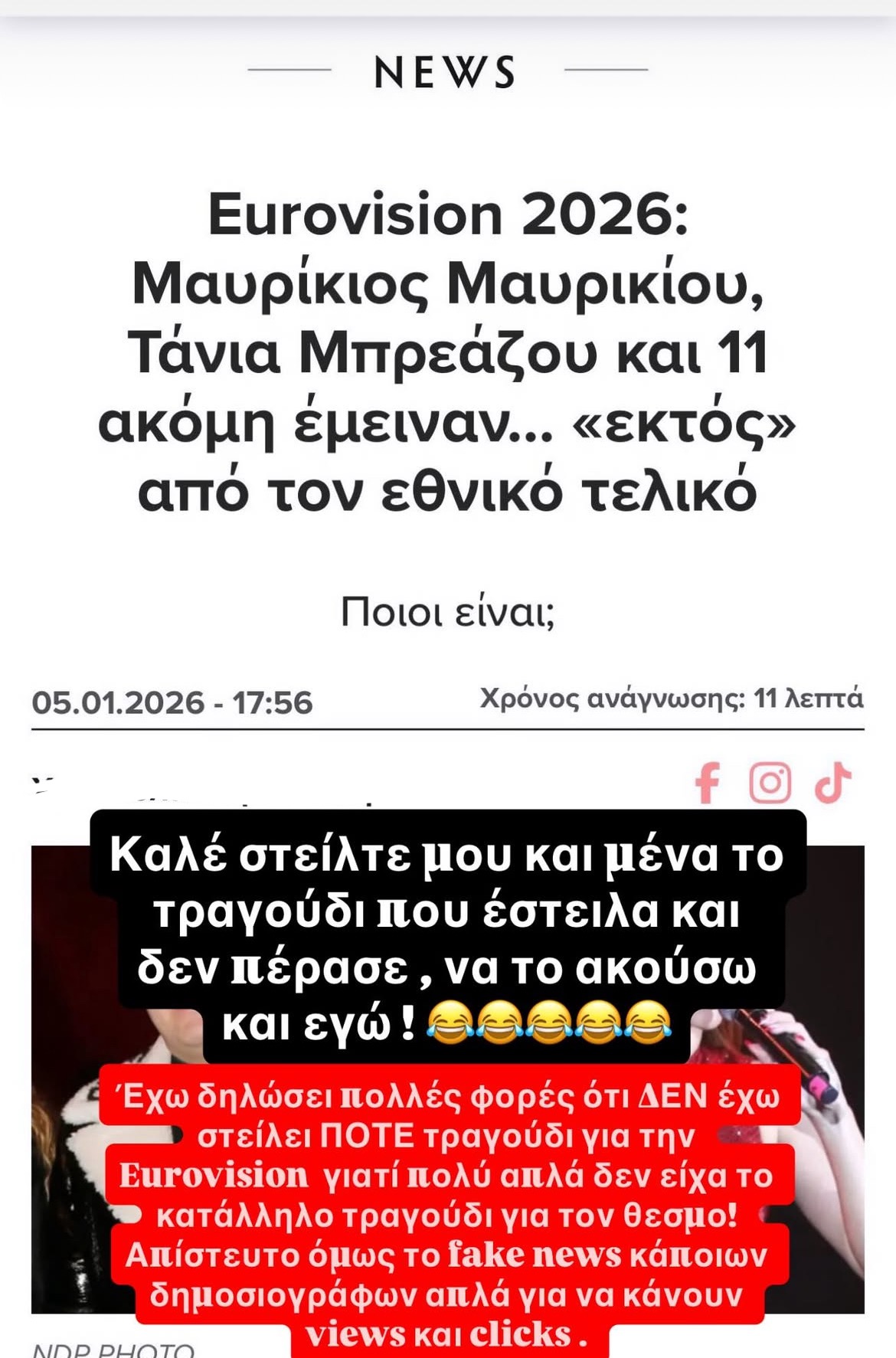 Ωστόσο, η ίδια η Τάνια Μπρεάζου έσπευσε να διαψεύσει κατηγορηματικά τις σχετικές φήμες. Μέσα από ανάρτηση σε story στον προσωπικό της λογαριασμό στο Instagram, ξεκαθάρισε πως ουδέποτε υπέβαλε συμμετοχή για τον εθνικό τελικό της Eurovision, τονίζοντας ότι τα δημοσιεύματα που τη θέλουν «εκτός» είναι απολύτως αναληθή.