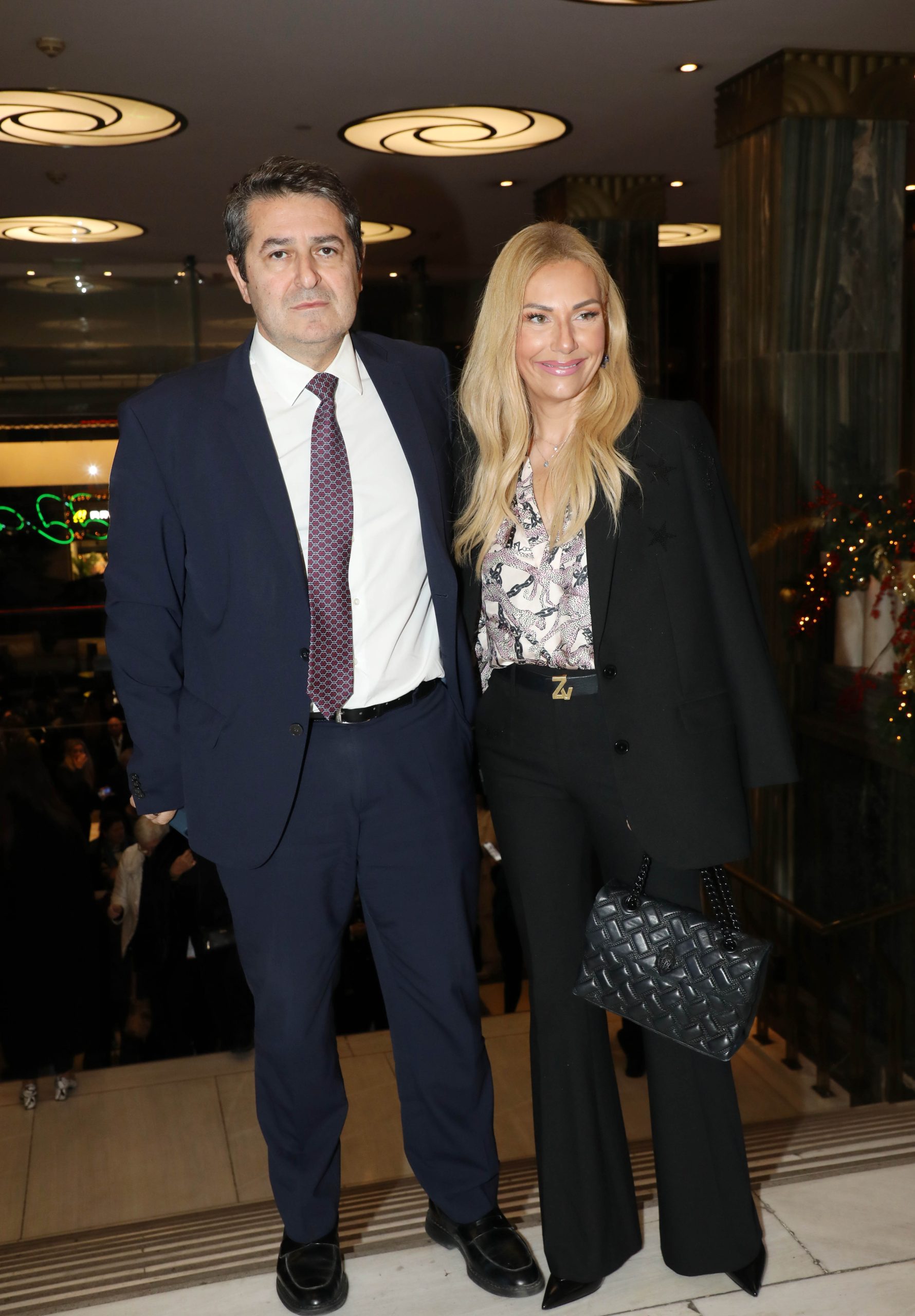 Δίπλα του, η Τίνα Μεσσαροπούλου κινήθηκε σε total black συνδυασμό: μαύρο παντελόνι σε ίσια γραμμή, σακάκι ριγμένο στους ώμους και εμπριμέ πουκάμισο, ενώ κρατούσε μία μαύρη, καπιτονέ τσάντα.