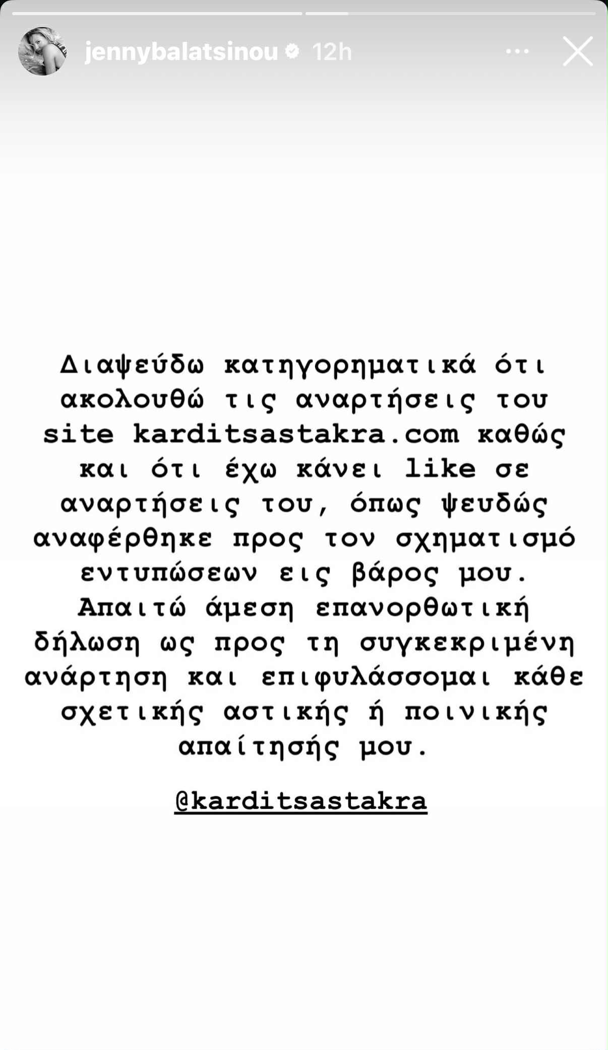 Με αυτή τη δημόσια τοποθέτηση, η Τζένη Μπαλατσινού ξεκαθαρίζει ότι αρνείται κατηγορηματικά οποιαδήποτε διαδικτυακή «στήριξη» σε αναρτήσεις κατά της κυβέρνησης και ζητά ρητά από τους διαχειριστές του λογαριασμού που έκανε τη σχετική ανάρτηση να προχωρήσουν σε επανόρθωση. Παράλληλα, επισημαίνει πως επιφυλάσσεται για κάθε νόμιμο δικαίωμά της, αφήνοντας ανοιχτό το ενδεχόμενο να κινηθεί και δικαστικά.