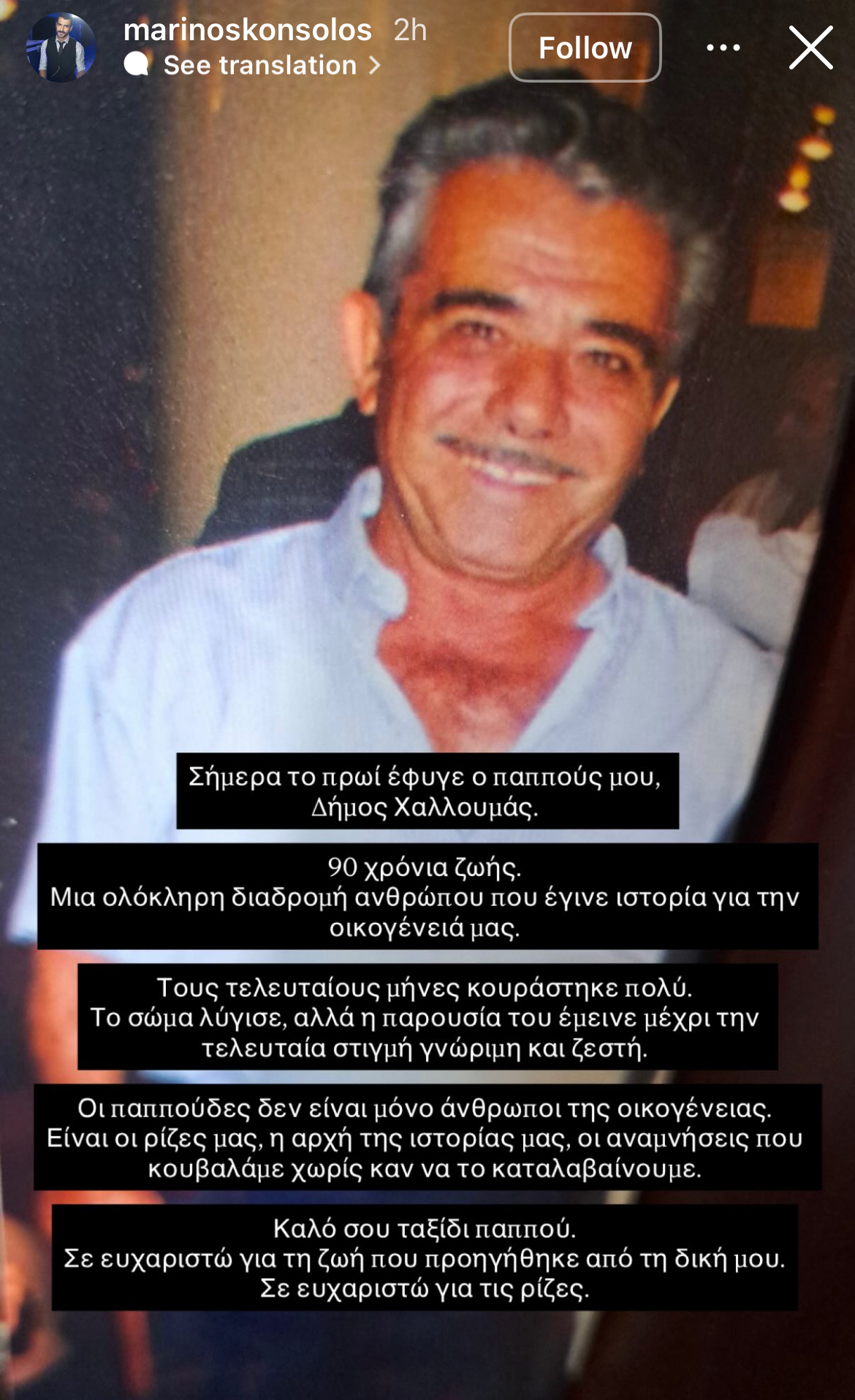 Δύσκολες στιγμές βιώνει ο ηθοποιός Μαρίνος Κόνσολος, καθώς όπως γνωστοποίησε ο ίδιος μέσα από τον προσωπικό του λογαριασμό στο Instagram, το πρωί της 23ης Φεβρουαρίου έφυγε από τη ζωή ο πολυαγαπημένος του παππούς.