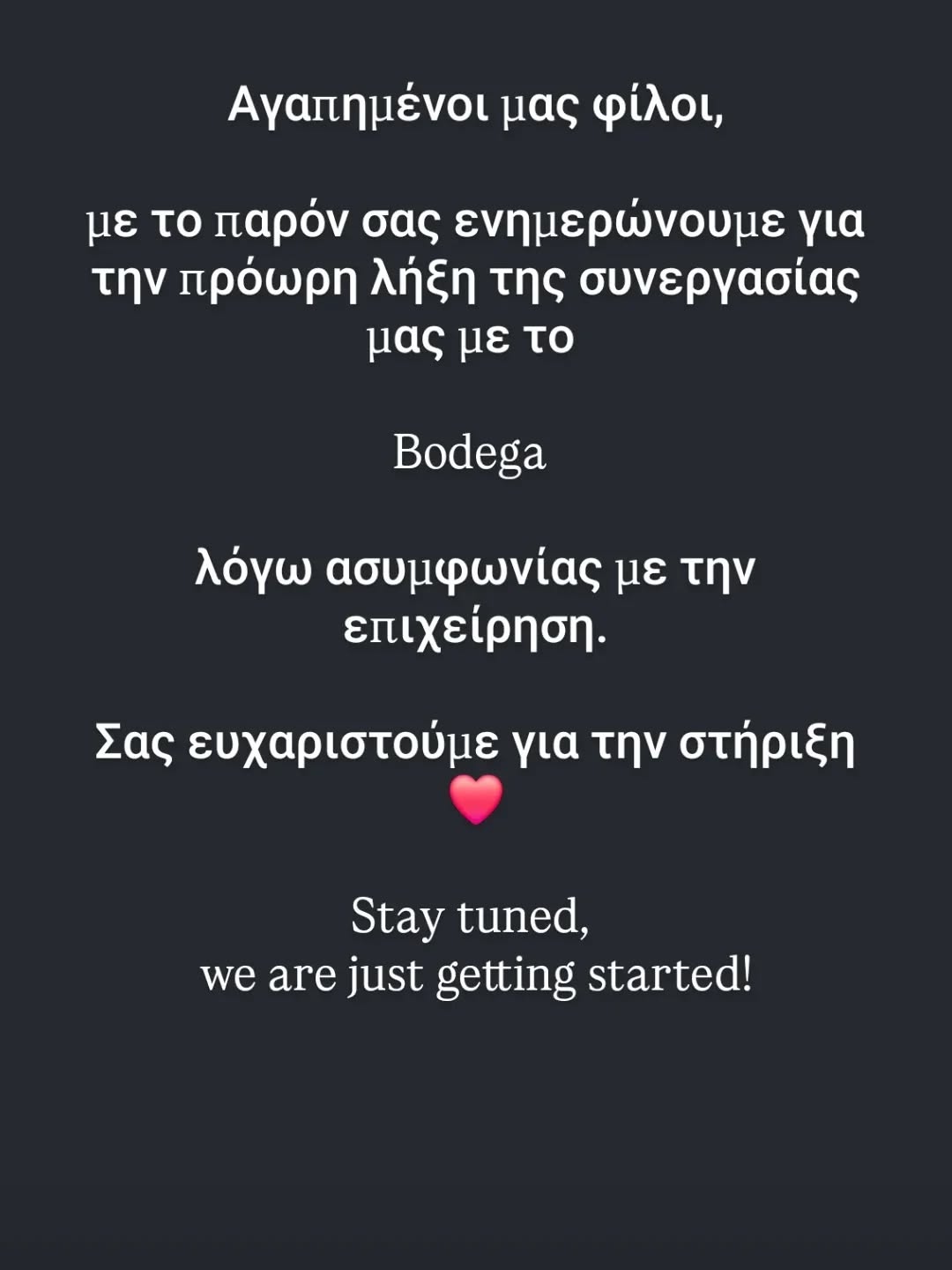 Οι VEGAS ανακοίνωσαν σήμερα ότι η συνεργασία τους με το Bodega φτάνει στο τέλος της, λίγες μέρε μετά την πραγματοποίηση της πρεμιέρας του μαγαζιού χωρίς να εμφανιστούν βέβαια εκείνοι.