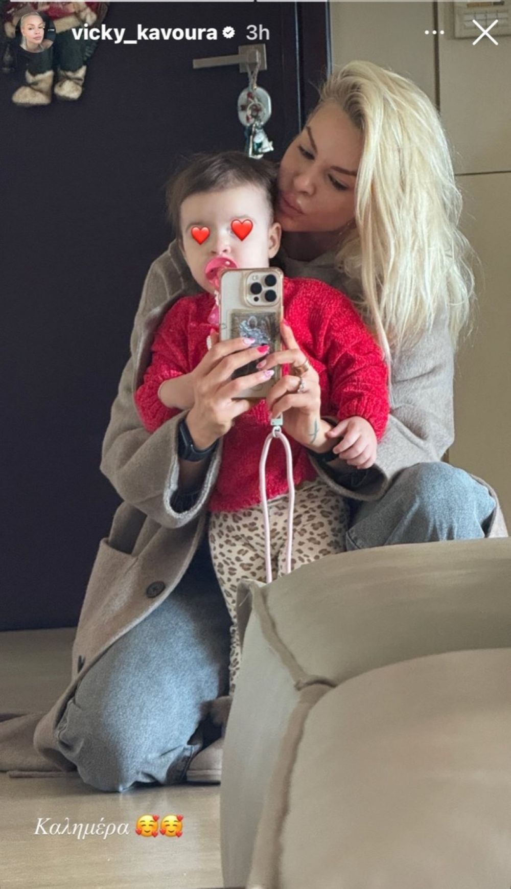 Στη φωτογραφία, η Βίκυ Κάβουρα εμφανίζεται χαλαρή, σε cozy look. Η μικρή, με πιπίλα, φορά ένα κόκκινο πλεκτό και animal print παντελόνι. Παράλληλα, η ηθοποιός διατήρησε την ιδιωτικότητα της κόρης της, καλύπτοντας το πρόσωπό της με καρδιές, μια επιλογή που ακολουθεί σταθερά, δείχνοντας πως θέλει να προστατεύει το παιδί της, χωρίς όμως να κρύβει τη χαρά της μητρότητας.