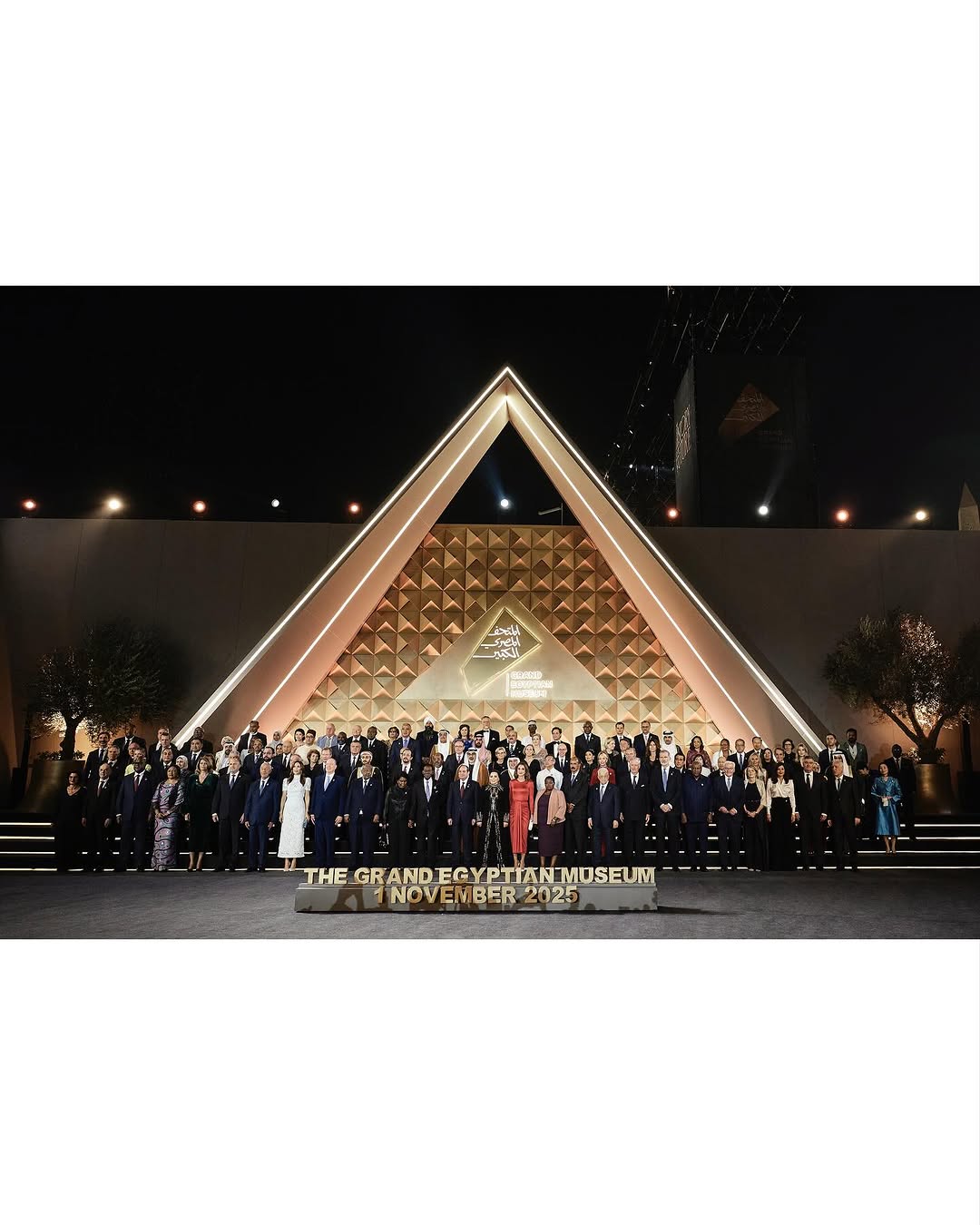Το ζευγάρι φωτογραφήθηκε μπροστά από την εντυπωσιακή, γεωμετρική πρόσοψη του μουσείου, ενώ στη συνέχεια συμμετείχε και στη μεγάλη ομαδική φωτογραφία μαζί με τους υπόλοιπους ηγέτες και συνοδούς τους.