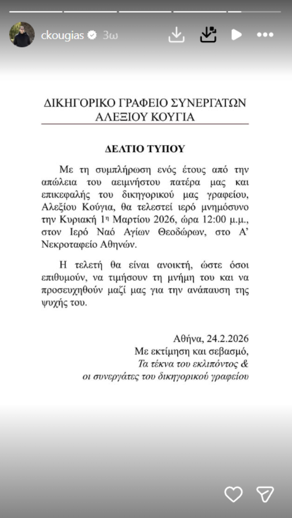 Όπως αναφέρεται: «Με τη συμπλήρωση ενός έτους από την απώλεια του αειμνήστου πατέρα μας και επικεφαλής του δικηγορικού μας γραφείου, Αλεξίου Κούγια, θα τελεστεί ιερό μνημόσυνο την Κυριακή 1η Μαρτίου 2026, ώρα 12:00 μ.μ., στον Ιερό Ναό Αγίων Θεοδώρων, στο Α’ Νεκροταφείο Αθηνών». Παράλληλα, προστίθεται ότι η τελετή θα είναι ανοιχτή: «Η τελετή θα είναι ανοικτή, ώστε όσοι επιθυμούν, να τιμήσουν τη μνήμη του και να προσευχηθούν μαζί μας για την ανάπαυση της ψυχής του».