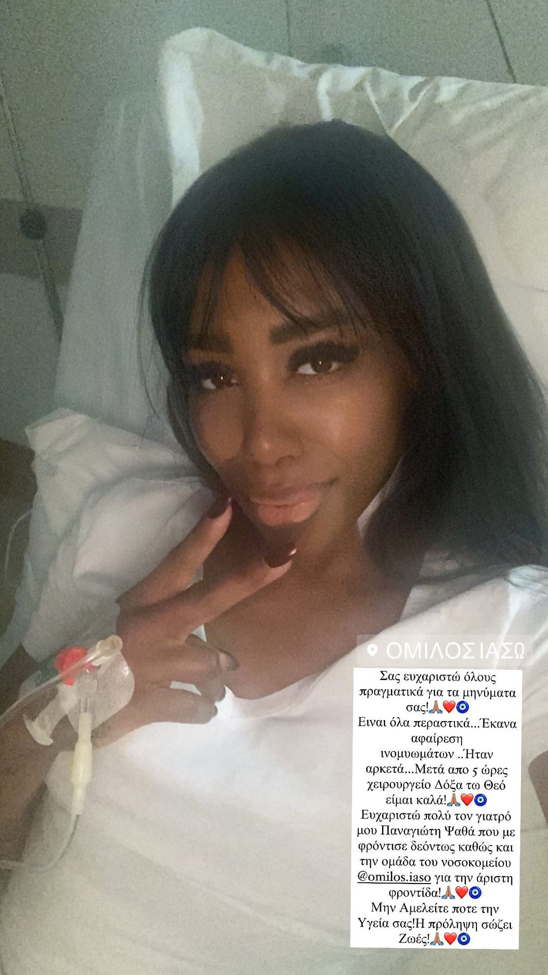 «Σας ευχαριστώ όλους για τα μηνύματά σας. Είναι όλα περαστικά. Έκανα αφαίρεση ινομυωμάτων. Ήταν αρκετά. Μετά από 5 ώρες χειρουργείο, Δόξα τω Θεώ είμαι καλά», ανέφερε σε ανάρτησή της η δημοσιογράφος δημοσιεύοντας μια φωτογραφία της μέσα από την κλινική.