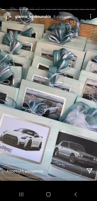 Την ημέρα της βάφτισης οι καλεσμένοι πήραν καδράκια με φωτογραφίες από συλλεκτικά αυτοκίνητα αφού αυτή ήταν η μπομπονιέρα που επέλεξαν.
