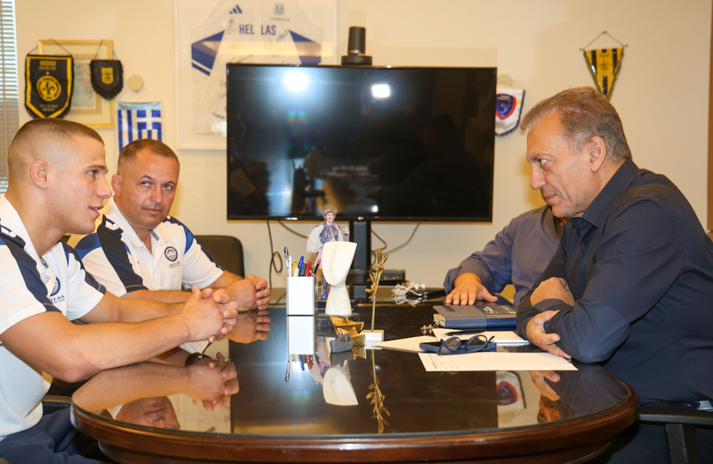 Ο αναπληρωτής υπουργός Αθλητισμού Γιάννης Βρούτσης υποδέχθηκε στο γραφείο του τον Παγκόσμιο πρωταθλητή Πάλης Γιώργο Κουγιουμτσίδη και συνεχάρη το φαινόμενο της ελληνικής Πάλης για την μεγάλη του επιτυχία, τονίζοντας ότι το Υπουργείο και η πολιτεία θα είναι πάντα δίπλα στον χρυσό πρωταθλητή! Στη συνάντηση παρευρέθηκε ο προπονητής του Θέμης Ιακωβίδης και ο Γενικός Γραμματέας της ΕΛΟΠ και Ολυμπιονίκης Κώστας Θάνος. Ο Γιώργος Κουγιουμτσίδης ευχαρίστησε θερμά τον κ. Βρούτση για την έμπρακτη στήριξη του. «Θα ήθελα να ευχαριστήσω τον Υπουργό, που είναι δίπλα μου και το δείχνει έμπρακτα. Με γεμίζει πολύ μεγάλη χαρά και μου δίνει δύναμη για τη συνέχεια αυτή η μεγάλη στήριξη, για τον μεγάλο μου στόχο που είναι το μετάλλιο στους Ολυμπιακούς Αγώνες. Θα ήθελα να ευχαριστήσω μέσα από την καρδιά μου όλους τους Έλληνες για τη μεγάλη αγάπη που μου έδειξαν», τόνισε ο Γιώργος Κουγιουμτσίδης.