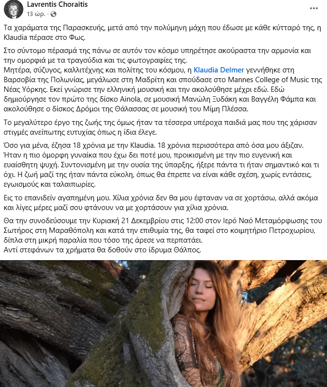 «Τα χαράματα της Παρασκευής, μετά από την πολύμηνη μάχη που έδωσε με κάθε κύτταρό της, η Κλαούντια πέρασε στο Φως. Στο σύντομο πέρασμά της πάνω σε αυτόν τον κόσμο υπηρέτησε ακούραστα την αρμονία και την ομορφιά με τα τραγούδια και τις φωτογραφίες της.