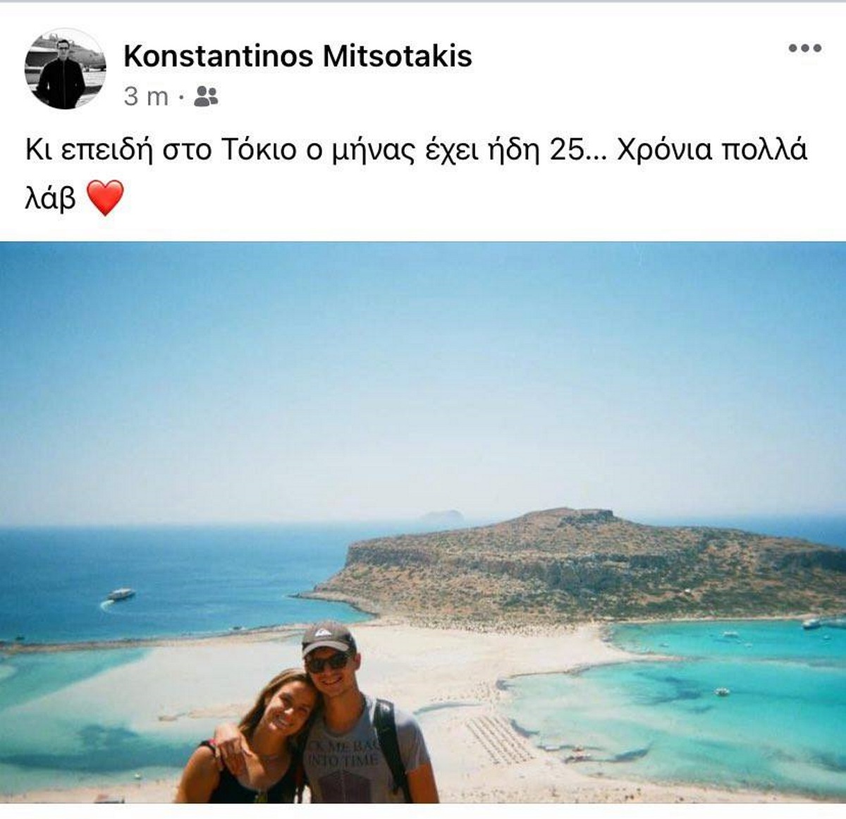 Ο γιος του πρωθυπουργού δημοσίευσε μία φωτογραφία από τις καλοκαιρινές διακοπές τους στην Κρήτη, στην οποία πόζαραν αγκαλιασμένοι με φόντο τη λιμνοθάλασσα του Μπάλου. «Κι επειδή στο Τόκιο ο μήνας έχει ήδη 25… Χρόνια πολλά αγάπη», έγραψε χαρακτηριστικά στη λεζάντα που την συνόδευε.