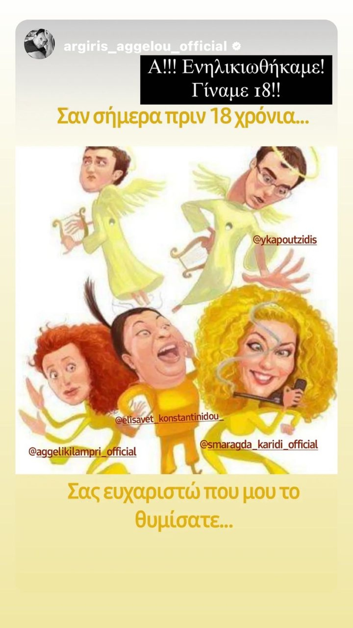 Ο Αργύρης Αγγέλου ανέβασε ένα story, στο οποίο βρίσκονται οι πέντε πρωταγωνιστές σε μορφή καρικατούρας, με τον ηθοποιό να γράφει: «Σαν σήμερα πριν 18 χρόνια. Σας ευχαριστώ που μου το θυμίσατε».